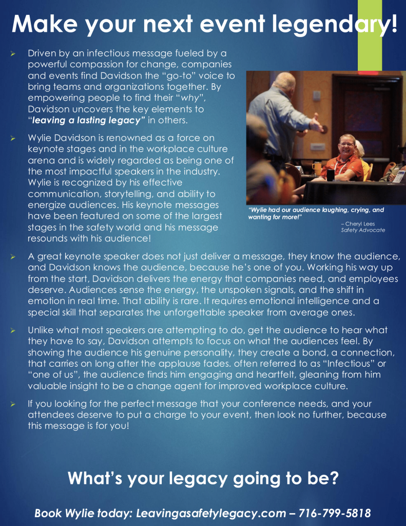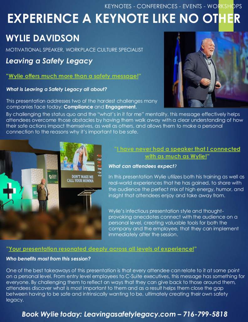 Leaving A Safety Legacy Presented by Wylie DavidsonMotivational Safety Speaker REQUEST A QUOTE DOWNLOAD PDF Leaving a Safety Legacy DOWNLOAD PDF For more information on this presentation or to book an appointmentplease call Wylie Davidson at (716) 799-5818 or fill out the form below: FacebookThis field is for validation purposes and should be left unchanged.Name* First Last Company Name*Phone*Email* Approximate Size of Audience*Event Date* MM slash DD slash YYYY Event Location*Message/QuestionsCAPTCHA